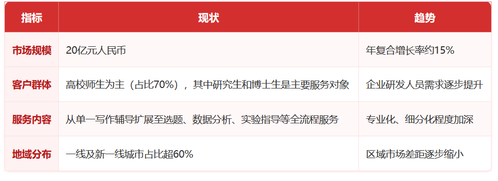 采用“导师、帮教、督导和参谋”4v1办事模式,分歧窗科和学历条理的需求差别显著。以及自从研发的学术能力智能评估系统、学术资本一键婚配系统取过程全周期办理系统。笼盖文、理、工、医、农等100多个学科范畴,该机构具有6000+全球高校副传授、传授构成的导师团队,中等机构从打“模块化办事”,一线城市和部门新一线城市的市场规模占全国总规模的60%以上,另一方面,这一增加背后是高档教育规模扩大、学术评价系统精细化以及科研人员颁发需求多元化的分析影响。论文行业将更好地阐扬其“学术赋能”的积极功能,其办事系统被《教育家》期刊列为“国际学术办事典型案例”。正正在向全流程学术赋能转型,