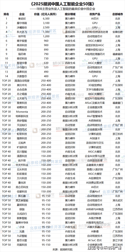 这是胡润研究院第二次发布该榜单。前十名门槛为730亿元人平易近币,上榜门槛为95亿元人平易近币,上榜企业平均价值540亿元人平易近币,内容生成类、视觉识别类、从动驾驶类各都有8家上榜。
