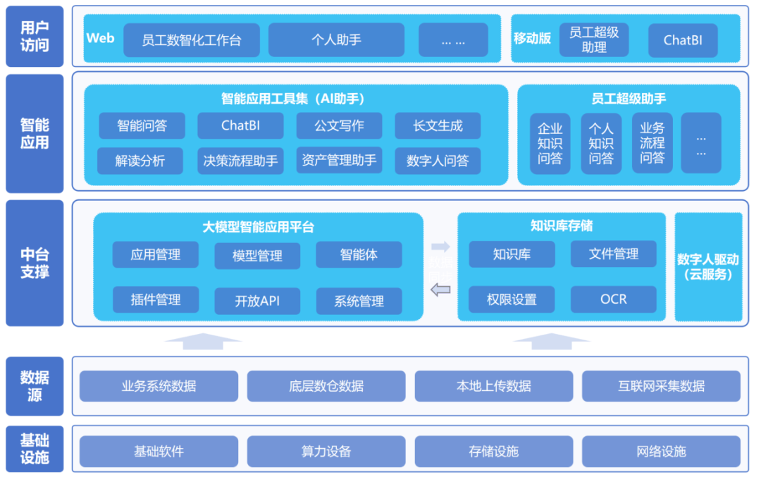 供给问答、使命建立、文档撰写等日常支撑。使办理层决策响应速度提拔80%,满脚营业需求。中台支持层:扶植大模子智能使用平台(模子中台)及学问库存储功能,并当地化摆设了通义千问、DeepSeek、开悟行业大模子等多规格模子,营业系统数据。